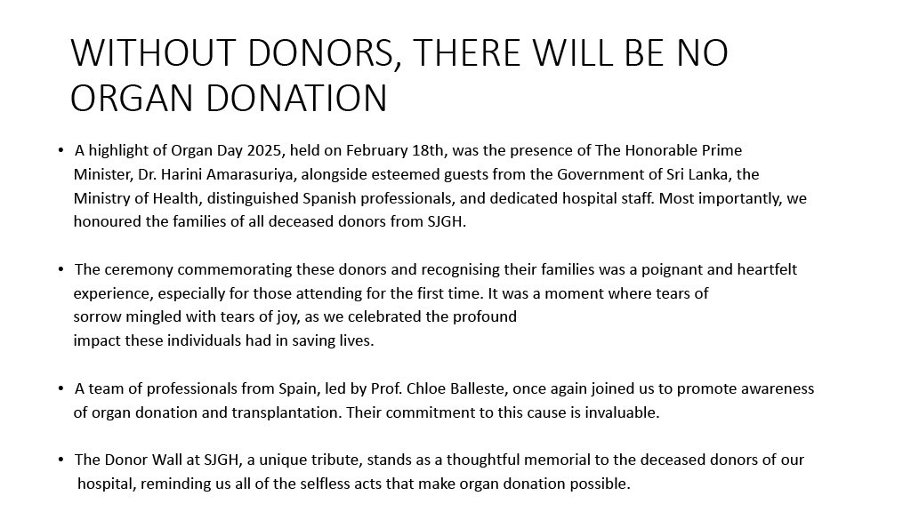 A highlight of Organ Day 2025, held on February 18th, was the presence of The Honorable Prime Minister, Dr. Harini Amarasuriya, alongside esteemed guests from the Government of Sri Lanka, the Ministry of Health, distinguished Spanish professionals, and dedicated hospital staff. Most importantly, we honoured the families of all deceased donors from SJGH.